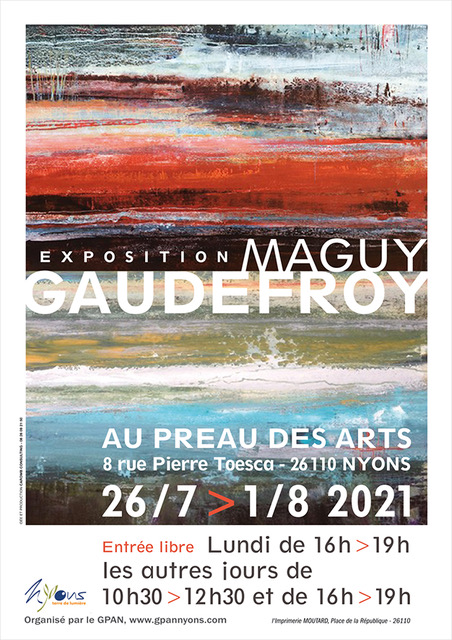 Exposition – Maguy Gaudefroy Publié le 25 juillet 202125 juillet 2021 par FL Il y a mille et une façon d’interpréter les magnifiques tableaux de cette artiste accomplie. Elle travaille et installe ses couleurs en couches superposées pour obtenir un résultat laissant libre court à la rêverie. Vernissage le mardi 27 juillet à 18h30.Partager : Partager sur Facebook(ouvre dans une nouvelle fenêtre) Facebook Partager sur X(ouvre dans une nouvelle fenêtre) X Partager sur Pinterest(ouvre dans une nouvelle fenêtre) Pinterest Envoyer un lien par e-mail à un ami(ouvre dans une nouvelle fenêtre) E-mail Sur le même thème