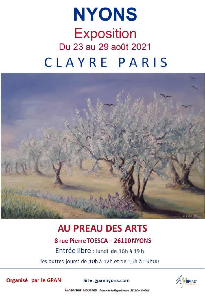Exposition – Clayre Paris Publié le 20 août 2021 par FL Cette artiste bien connue des Nyonsais nous présente ses paysages ainsi que ses nouveautés inspirées par l’univers fascinant de notre voute céleste. Vernissage le mardi 24 août à 18h30. Partager : Partager sur Facebook(ouvre dans une nouvelle fenêtre) Facebook Partager sur X(ouvre dans une nouvelle fenêtre) X Partager sur Pinterest(ouvre dans une nouvelle fenêtre) Pinterest Envoyer un lien par e-mail à un ami(ouvre dans une nouvelle fenêtre) E-mail Sur le même thème