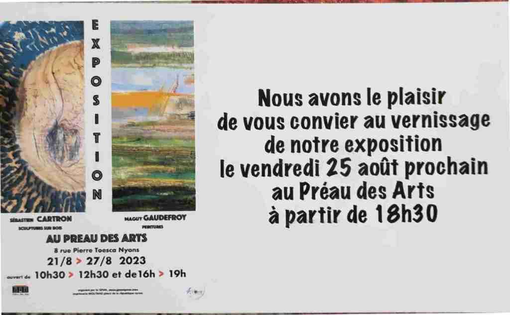 Les nouvelles toiles de Maguy Gaudefroy et les sculptures sur bois d’olivier de Sébastien Cartron seront exposées du 21 au 27 août au Préau des Arts, de 10h30 à 12h30 et de 16h à 19h.