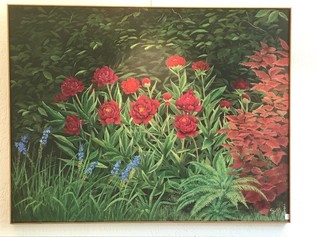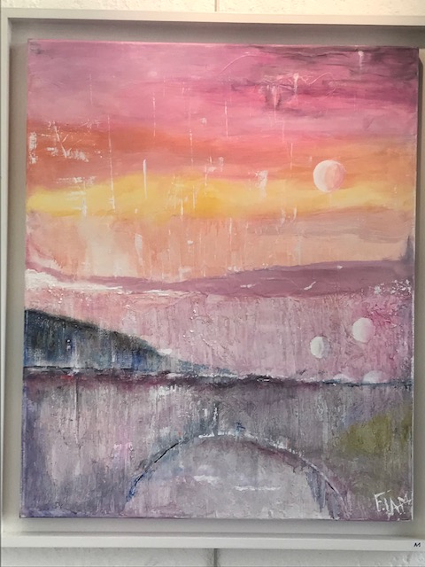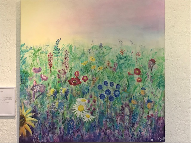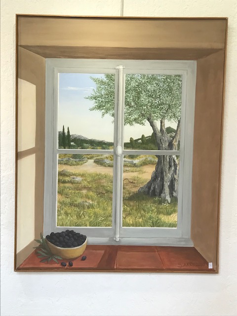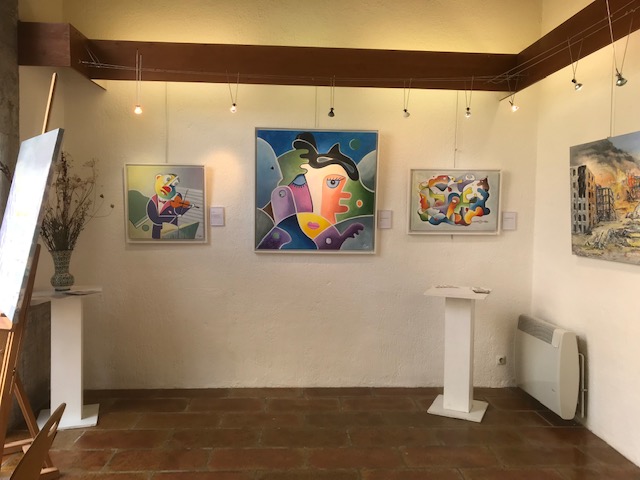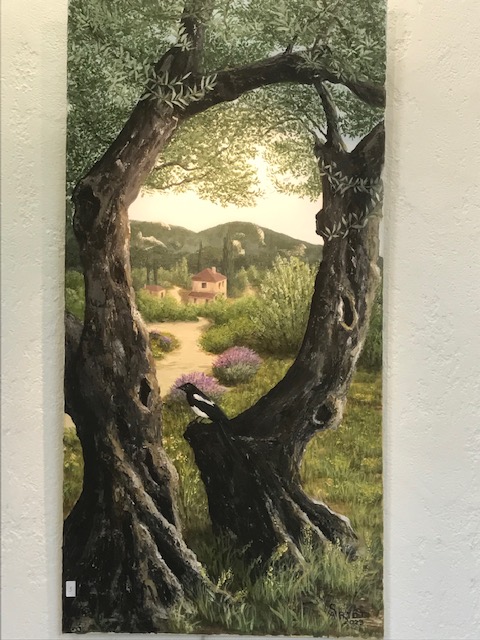 Fantaisie et rigueur sont les mots qui pourraient caractériser le contraste entre l’oeuvre de Francis Lambert et celle de Sylvie Artôt, toutes deux exposées au Préau des Arts jusqu’à dimanche 24 septembre. Pourtant, à y regarder de près, la rigueur de l’une apparaît dans l’autre et la fantaisie de l’un entre dans les toiles de sa voisine (au sens propre du terme d’ailleurs puisqu’ils sont voisins à Nyons!). Il y a chez Francis du Picasso, qui s’essaie à de multiples styles, depuis les clowns bariolés et des portraits géométriques aux couleurs délicates jusqu’à des paysages aux couleurs froides ou chaudes qui évoquent des planètes lointaines. Et puis il y a le souci d’être proche de l’actualité la plus dure: ainsi ce Marioupol en ruines et en feu. Quant à Sylvie, elle vient du théâtre, elle a effectué de nombreux décors quand elle était en Belgique ou ailleurs, et en gardé une technique du trompe l’oeil stupéfiante, dans des fenêtres vers des champs d’oliviers ou des jardins de pivoines. sa fantaisie à elle est dans une pie qui se pose subrepticement entre deux troncs d’arbre. Elle expose également de gros classeurs qui permettent de voir les travaux effectués chez des particuliers ou dans des lieux publics, afin d’égayer un mur ou de donner vie à une façade.