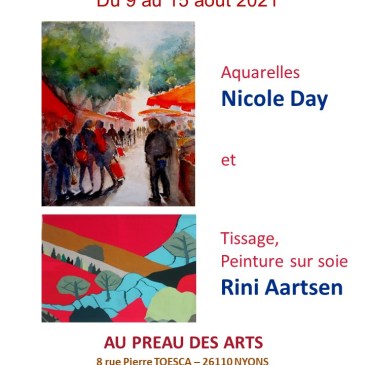 Nicole Day : Cette artiste, diplômée des Beaux-Arts, bien connue dans la région nous expose ses superbes aquarelles mouillées à la lumière provençale. Rini Aartsen : Les visiteurs pourront admirer le travail remarquable du tissage et des peintures sur soie de cette artiste Mollanaise.