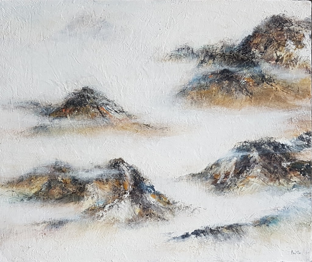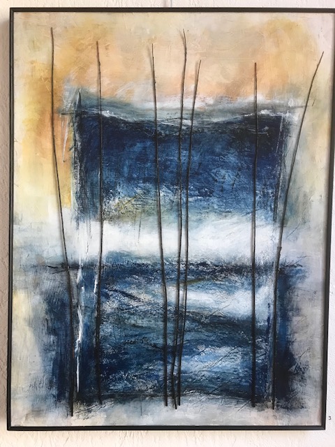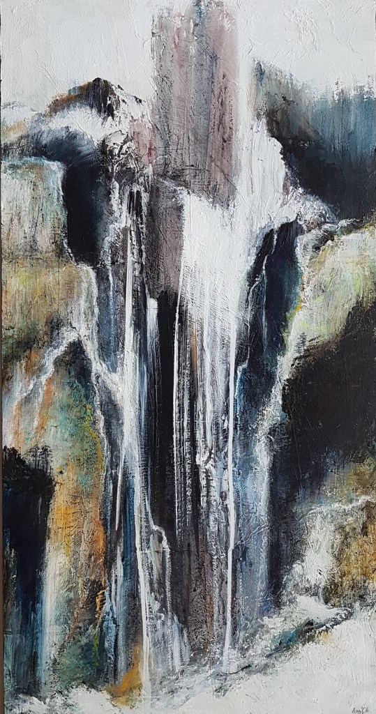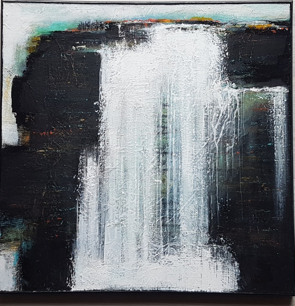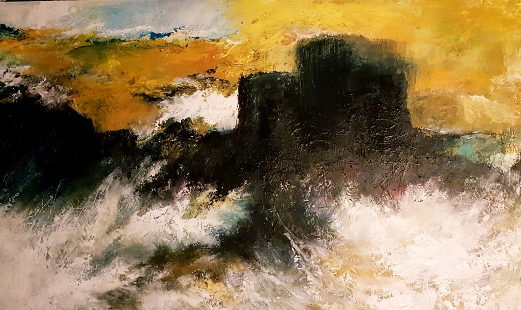 A la manière de Monet, Pollock, Zao Wou-Ki, j’affronte les grands formats et, telle une danseuse qui se déplace autour de la toile posée à plat sur le sol, va-et-vient dessus, j’entre en peinture, j’entre dans la peinture !